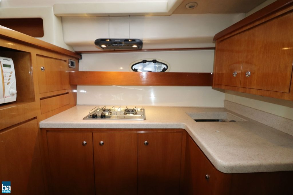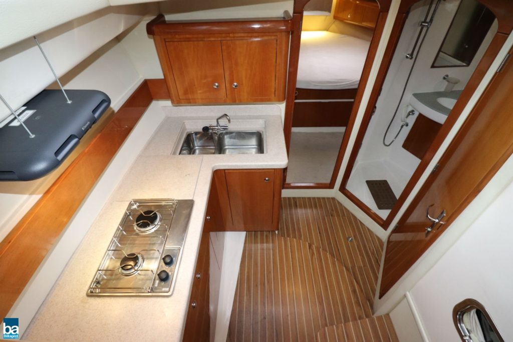 Invändigt upplevs hon som mycket ljus, inte bara för att hon har ljus inredning utan även av de stora fönstren som släpper in mycket ljus och skapar en mycket behaglig atmosfär. I salongen ryms en dinette som är bäddbar, förarplats med dubbelsoffa och en skåpsrad med avställningsytor. En trappa ner finner man ett fullutrustat kök med spis, kyl, micro och kolfilterfläkt. Mittkabin med dubbelkoj och skåp. En förpik med dubbelkoj och massor med stuvutrymme. Mellan kabinerna finns WC-utrymmet som är väl tilltaget.