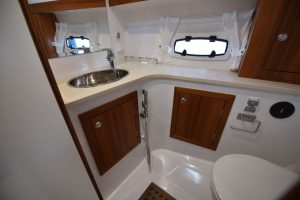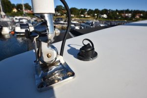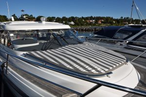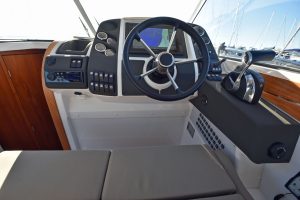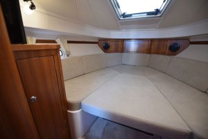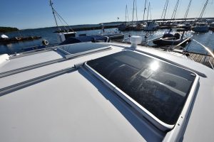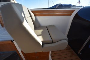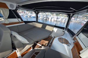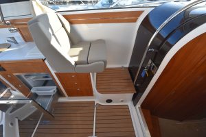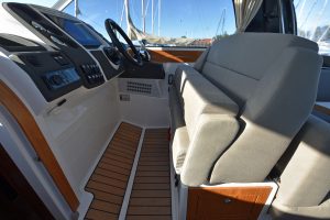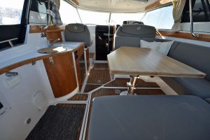 Båten har en yt-effektiv planlösning, där många kan umgås och trivas. Öppet akterparti med en u-soffa, som för tankarna till en lounge, ger plats för 7 personer att sitta runt det stora matbordet. Soliga dagar blir soffan en underbar solbädd genom ett knapptryck på det elmanövrerade bordet. Att pentryt finns uppe i båten i anslutning till bordet är uppskattat av många. Man avnjuter den goda maten som tillagats i det inventiösa pentryt där inget saknas. Keramisk häll, stort kylskåp, djup vask och praktiska avställningsytor är standard!"