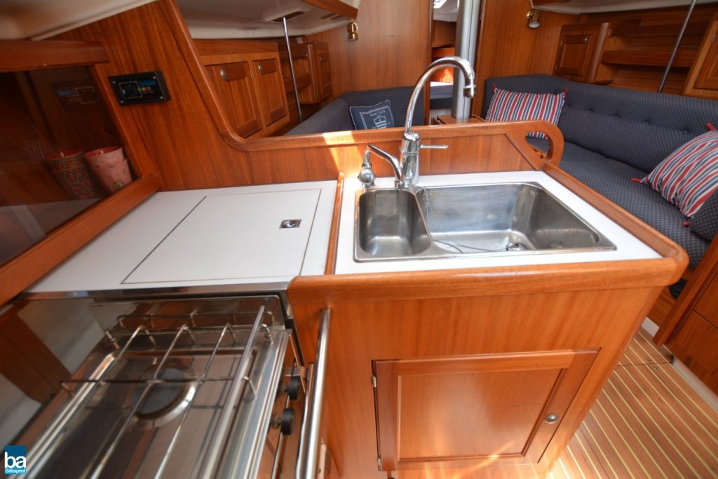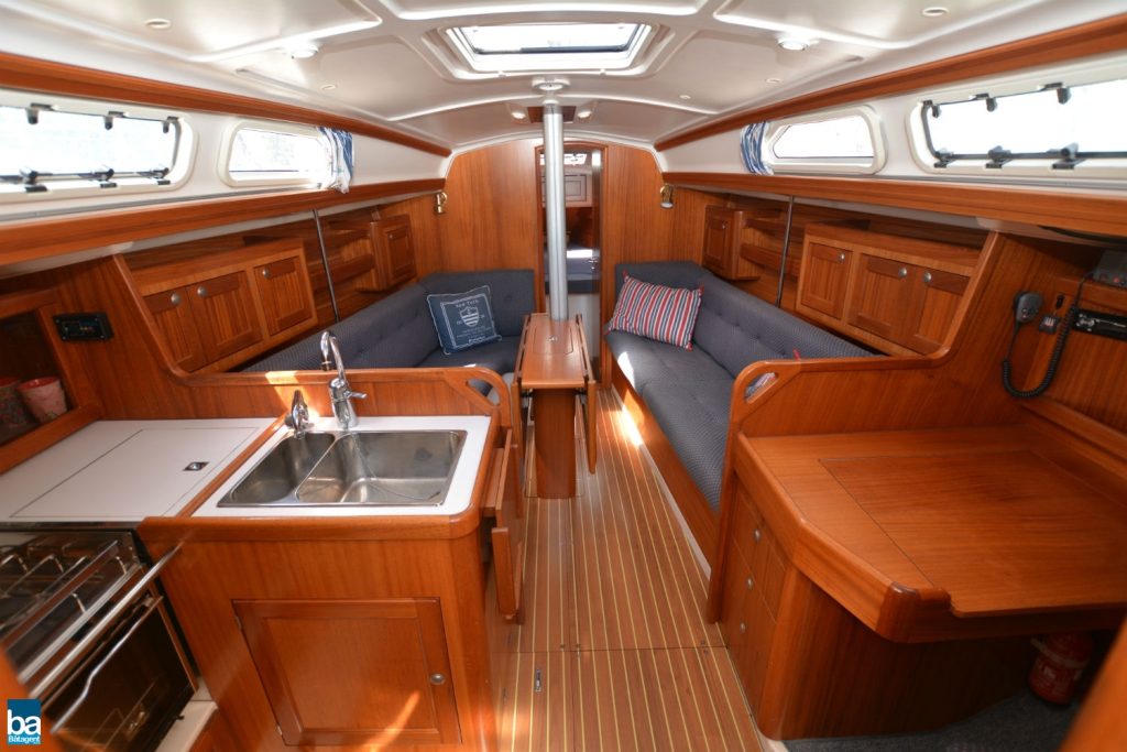 Klassisk inredning med pentry om babord och navigationsbord till styrbord. Akteröver om styrbord hittar man den rymliga toaletten. I toalettutrymmet finns även en praktisk plats för blöta sjökläder. Akteröver på babods sida finns en rymlig akterhytt med bra förvaringsmöjligheter. Pentryt har spis med ugn, kyl och dubbla diskhoar med kran för sjövatten finns.