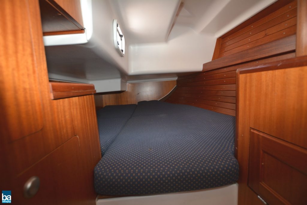 Bäddbar salong, barbordskojen ger med den extra iläggsdynan väl tilltagen bredd och god sovkomfort. En rymlig förpik med bra förvaring och en tjock madrass.