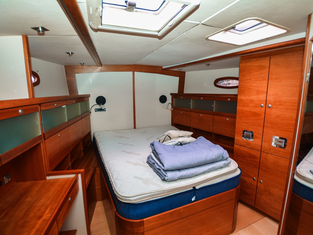 Perässä on kaksi tilavaa hyttiä sekä WC suihkulla. Toinen WC on muutettu hyötytilaksi, jossa on esimerkiksi pesukone, mutta tila on helppo palauttaa WC tilaksi suihkulla tarvittaessa.