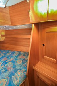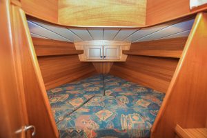 Keulakajuutassa on V-vuode ja reilusti säilytystilaa.