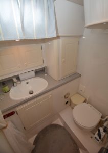 Oikealla, sisäänkäynnin vieressä, on valoisa WC suihkulla ja runsaalla kaappitilalla. WC on asennettu pitkittäin, joten sitä voi käyttää kaikilla halsseilla
