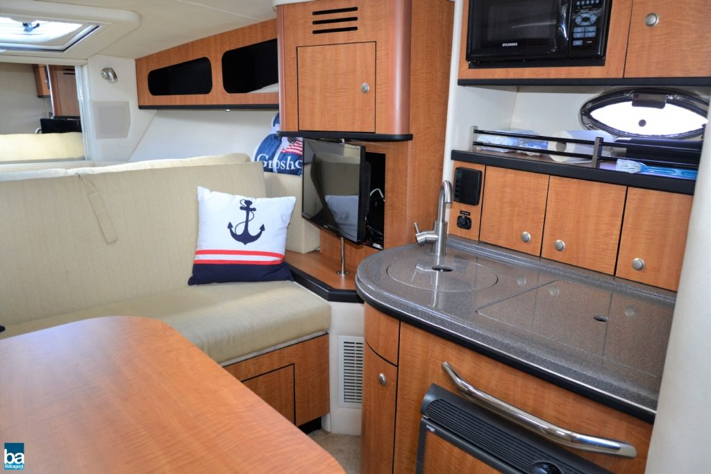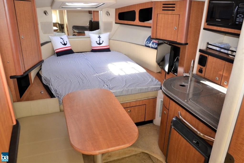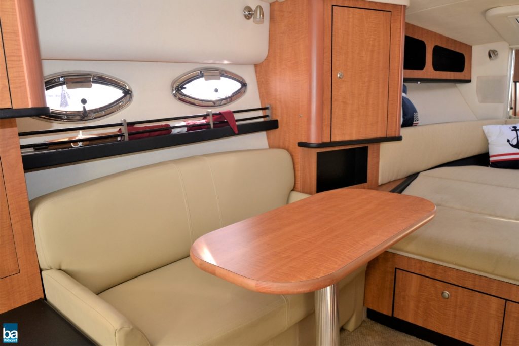 Denna Sea Ray 325 Sundancer har blått skrov med vit vattenlinje och däck. Sittbrunnen har en stor sittgrupp, solterrass och en bar med kylskåp. Dynorna är vita och durken kan täckas med en bekväm matta. Under däck finns ett litet pentry, en bekväm soffa, ett litet matbord och en stor dubbelbädd längst fram i salongen. Akter om styrbord hittar män ett relativt stort toalett med vakuumtoalett och strax akter om detta en separat dubbelkoj som går in under sittbrunnen. Interiören har beige golvmatta, beige läderdynor och körsbärsglans på träarbeten. Massor av skåp och lådor finns överallt.